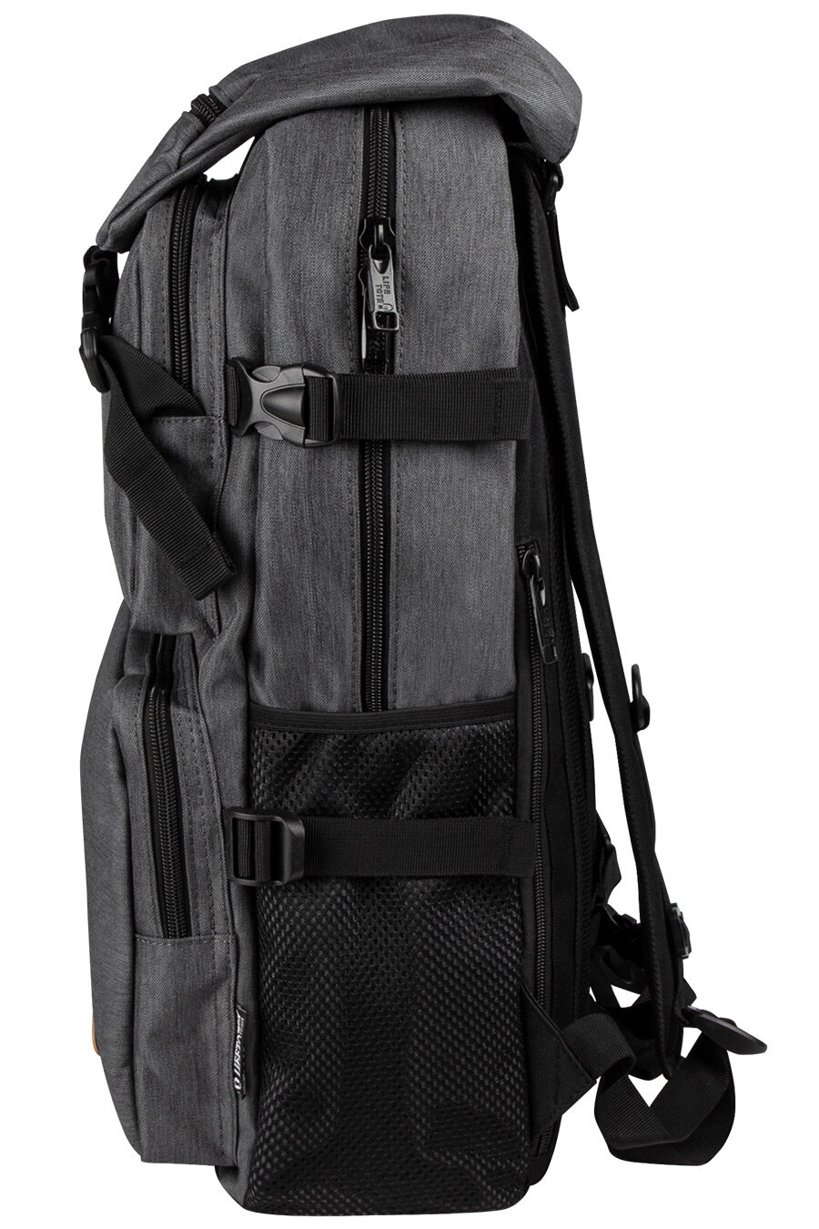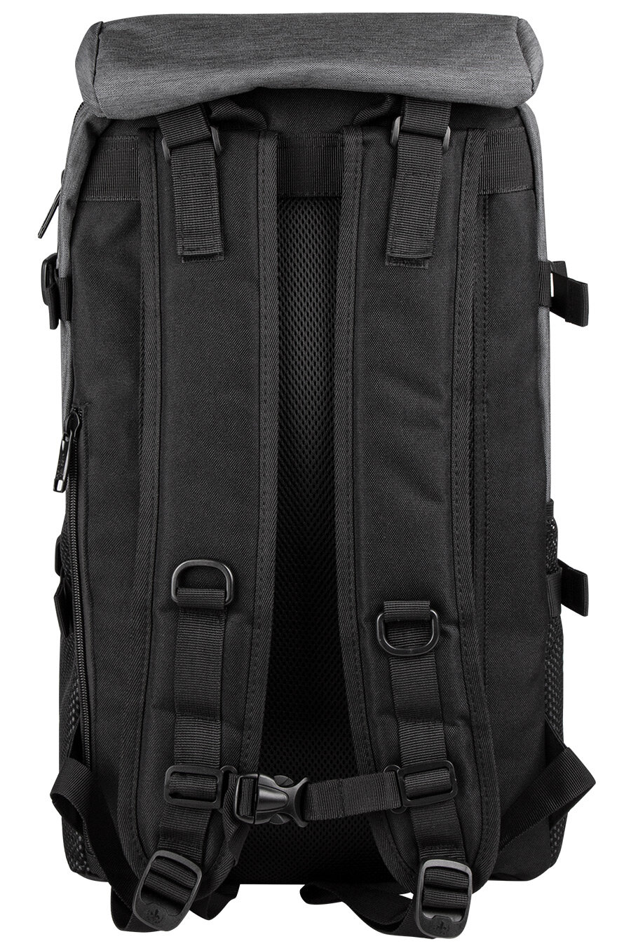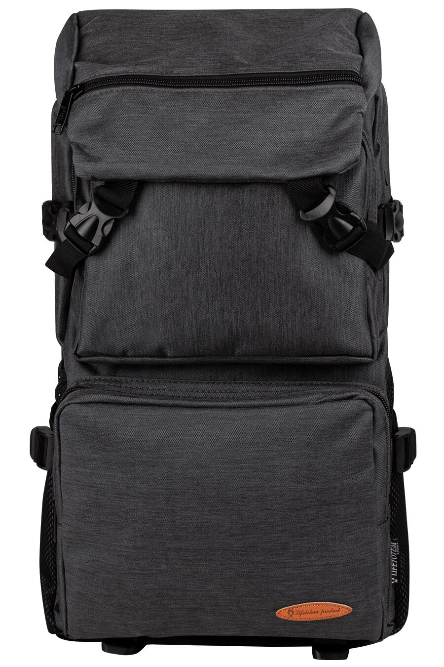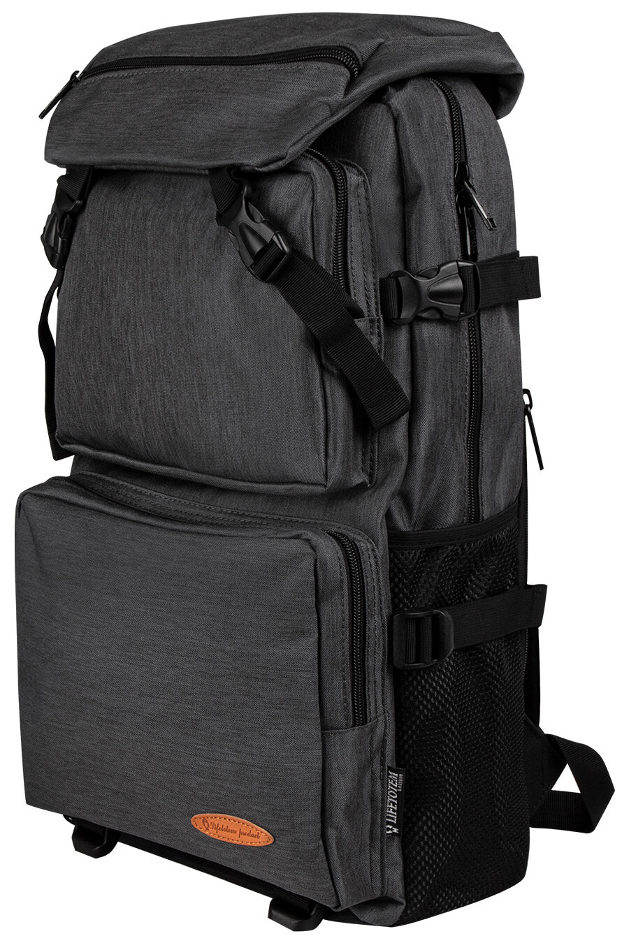 Туристический рюкзак для небольших путешествий, изготовленный из плотной ткани. Вместительное основное отделение на молнии, подкладка из гладкого нейлона, карман для ноутбука на липучке, внутренний карман на молнии, два дополнительных отделения на молнии в передней части, два боковых сетчатых кармана, крышка-клапан на застёжках "фастекс", карман на молнии на крышке, стропы-утяжки по бокам и в нижней части для регулирования объема и дополнительных креплений, стропа-перемычка между лямками, мягкие лямки и спинка с сеточкой, ручка для переноски.