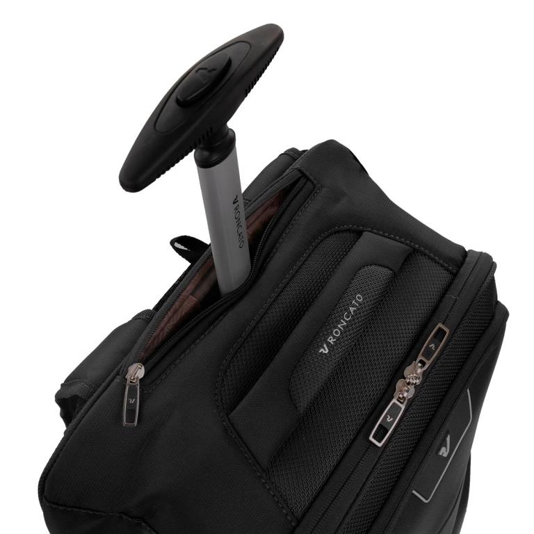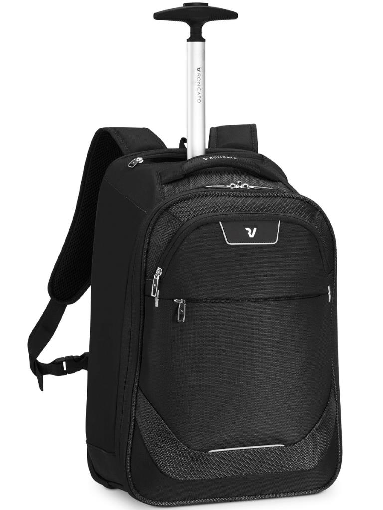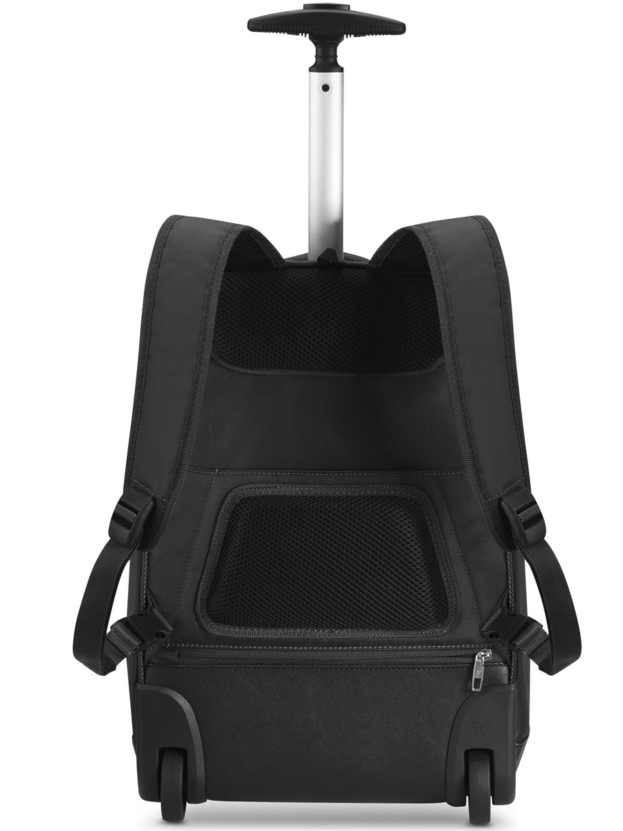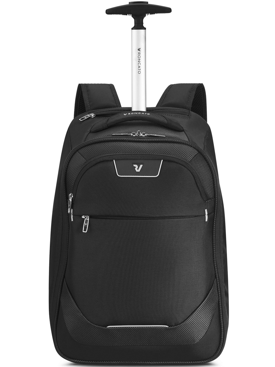 Рюкзак оснащен мягкой верхней ручкой для переноски и телескопической ручкой из легкого и прочного дюралюминия. Когда она не используется – ее можно убрать в специальный карман на молнии. Внизу расположены два прочных крупных колеса и выдвижная ножка.