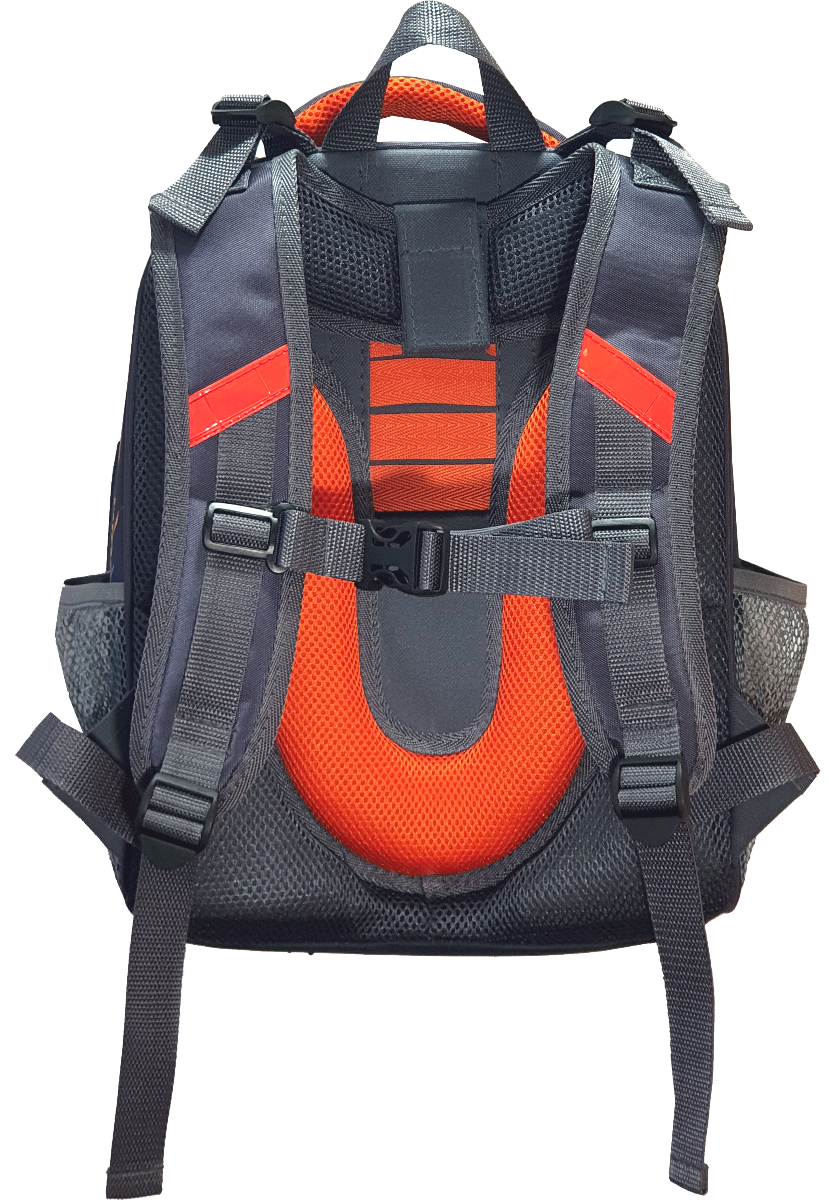Ранец снабжен надежным нагрудным фиксатором и двумя боковыми карманами из прочной сетки.