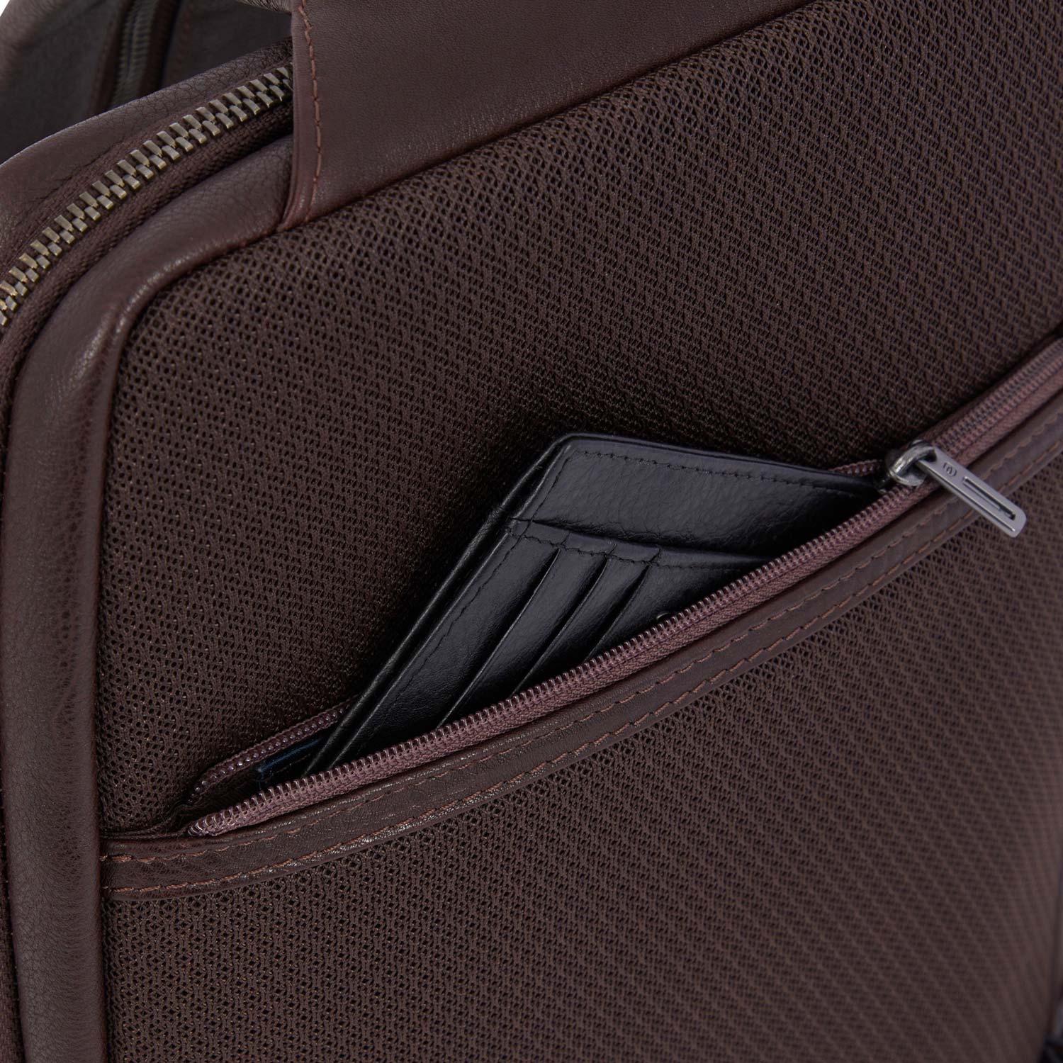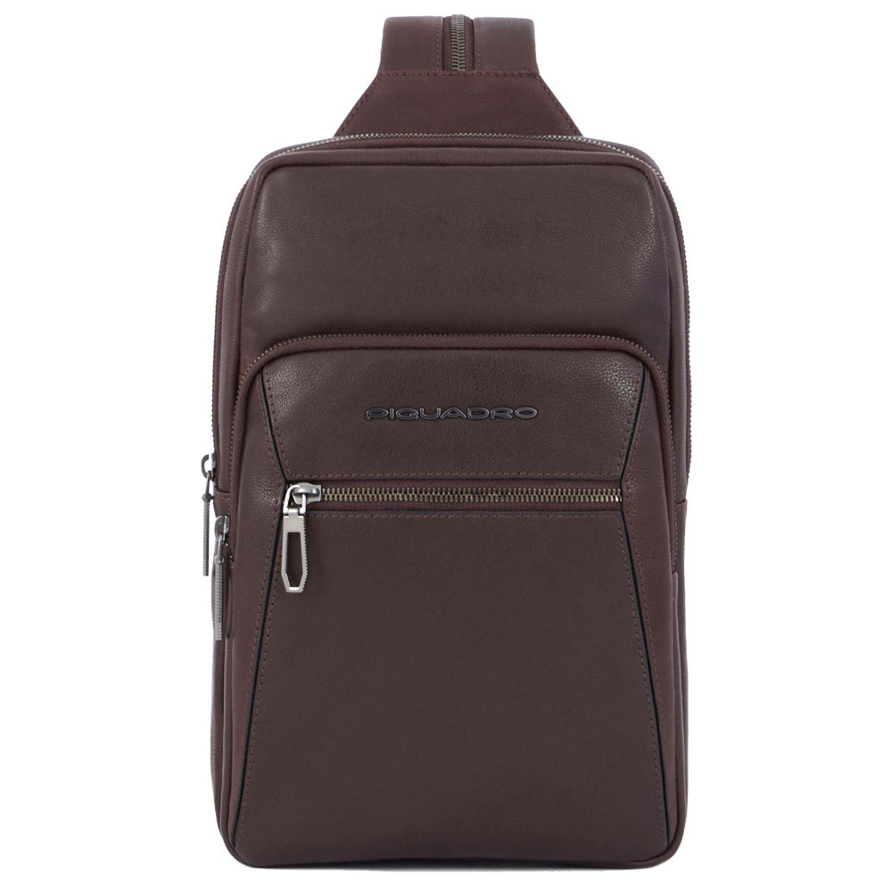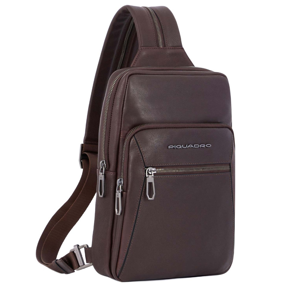 Рюкзак-слинг от Итальянского бренда Piquadro. Имеет одно основное отделение на молнии, в котором расположены: отделение для планшета, карман для мобильного телефона, карман для мелочей, держатель для пишущего инструмента, дополнительное отделение на молнии. Снаружи на передней и задней стенке карманы на молнии. Регулируемый плечевой ремень, разделяемый на 2 ремня при помощи молнии.