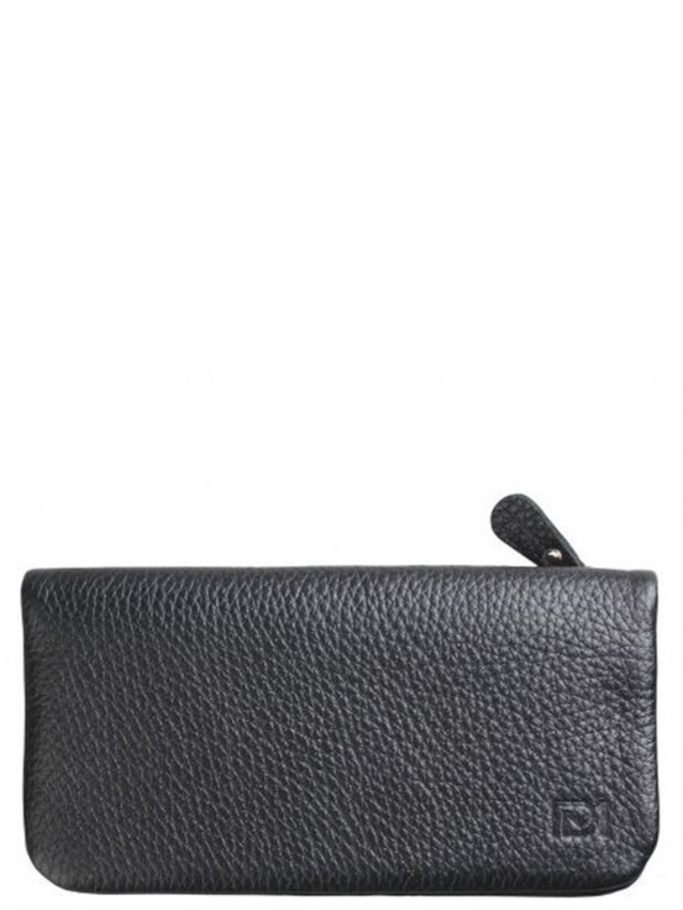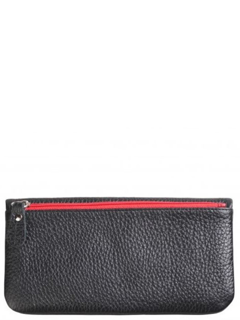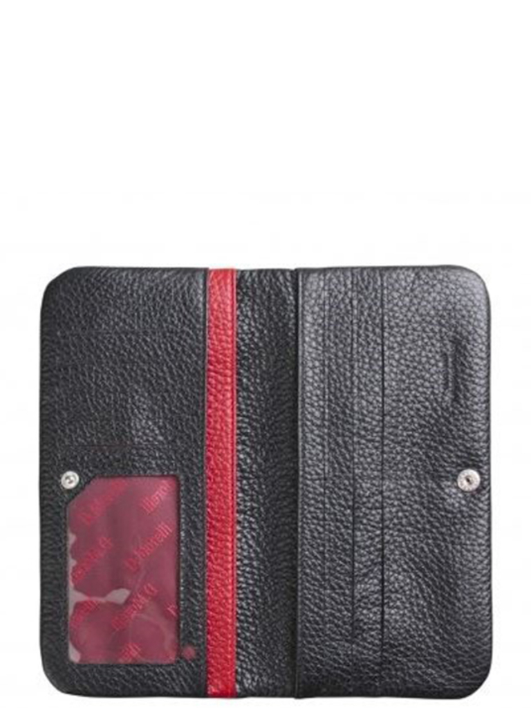Кошелек коллекции «Бриенна» от торговой марки Domenico Morelli изготовлен из натуральной кожи черного цвета с яркими деталями красного цвета. Модель раскрывается книжкой, фиксируется кнопкой. Внутри: отделения для купюр, карманы для карт, карман-окошко. На задней стороне – карман на молнии.