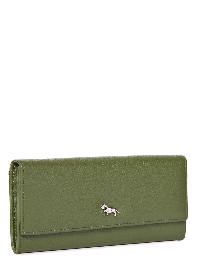 Женский кошелёк торговой марки LABBRA из натуральной кожи. Модель закрывается на клапан с кнопкой. Внутри кошелька есть 2 не складывающихся отделения для купюр и два дополнительных плоских кармана для купюр, . отделение для мелочи, которое закрывается на молнию, 14 карманов для карт и один плоский складывающийся карман для документов. На задней стенке кошелька есть открытый плоский карман.